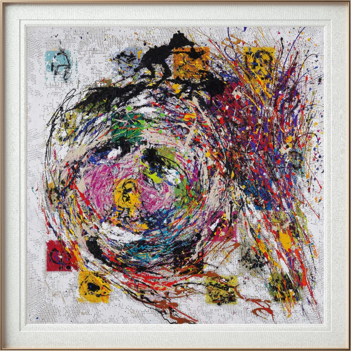 Description: The canvas explodes into a tempest of memory, a chaotic vortex of pink, yellow, blue, and black paint lines swirling rapidly into a central eye. A heavy, dark form—the shadow of a former self—hangs above the whirlwind. The overall effect is the unfiltered rush of childhood emotion: vibrant, confusing, intensely felt, and framed by the stability of the knitted foundation.