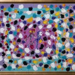 Description: Set against a soft, lavender-crocheted expanse, the painting evokes a weightless, liminal space. Two ethereal, abstracted figures—the artist’s self revisiting childhood—float gently, surrounded by large, cloud-like patches of white, black, and jewel tones. The rhythmic distribution of these color ‘bubbles’ suggests the slow, meditative, and non-linear flow of subconscious thought and memory.