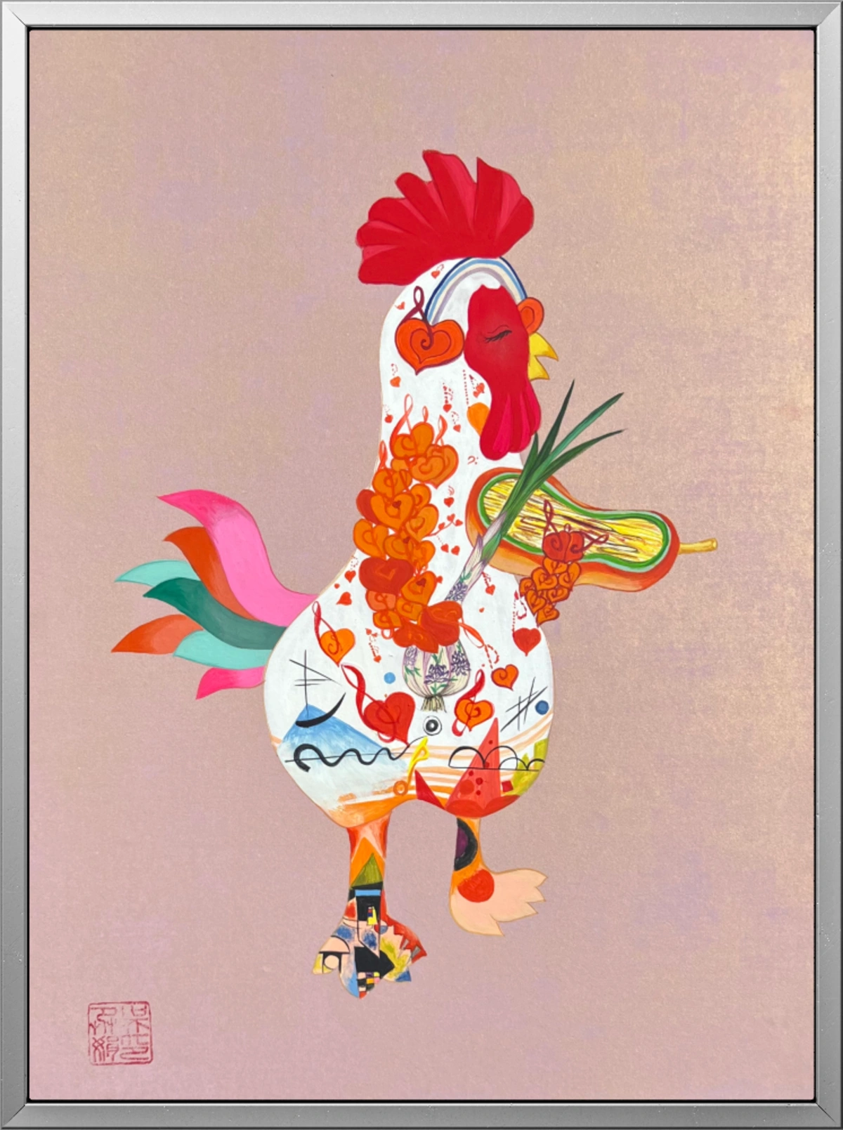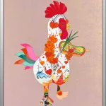 My creative vision for this piece was to visualize the physical experience of sound. I deliberately adorned the chicken’s ears, arms, and entire body with musical notes to show a holistic sensory journey: the ears hear the music, the limbs perform it, and the entire body vibrates with the rhythm.