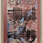 The raw wooden panel from Home Depot serves as a deliberate modern base, allowing its texture to integrate with the final abstract surface. Once attached, the paper was painted over with acrylics and accented with lines that include the subtle form of chopsticks, symbols of life companions.