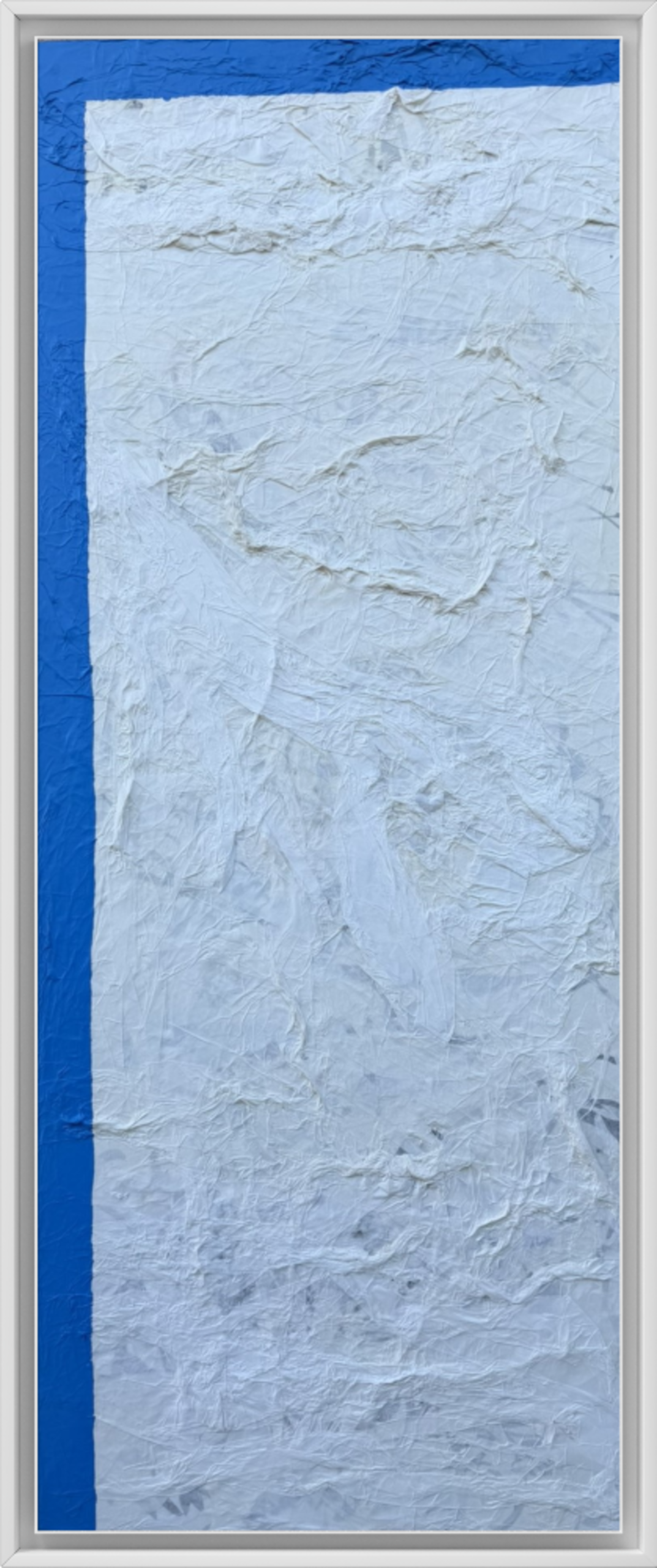 Description: This 16 x 40 inch vertical canvas is a minimalist, yet profound, study of the interior state of being. The artist uses Hanji (Korean rice paper) and two powerful contrasting elements to define the spiritual boundary of the self.