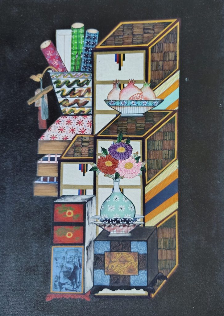 Bookshelf Painting (책가도) is a meaningful genre of Korean Minhwa that depicts bookshelves filled with books and scholarly items—brushes, scrolls, inkstones, ceramics, and occasionally fruit or flowers.